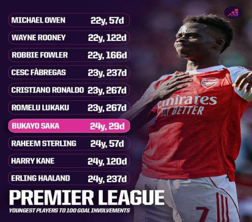 24歲29天,薩卡是英超參與100球第七年輕的球員